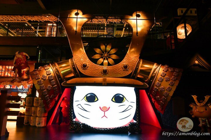 一進入工廠內,就可以看到有大型動畫螢幕播放及大量可以拍照留念的造景和公仔,連日本京都的千本鳥居、鞍馬車站大天狗都出現了,如果想拍照的話,這邊也很好拍。在戶外用餐區的地方,也有富士山及武士娃娃等造景可以拍照,記得要走出來看看。