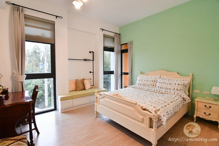 民宿主要就是雙人房和四人房兩種房型,雙人房全是一大床,四人房則是兩大床,更多民宿其他客房照片可以參考烏樹林從前從前民宿粉絲頁點我看照片,目前訂房也只有電話訂房或粉絲頁訂房兩種方式喔,平假日價格也會有差異,旅遊飲食主題客房設計比較歐風,木紋地板、歐式床組、實木書桌,都可以感受到民宿老闆對設備的要求,房內有2個採光明亮的大窗和一個小陽台,客房內走道空間很寬敞,可以打開28吋的行李箱沒有問題,整理行李很方便。