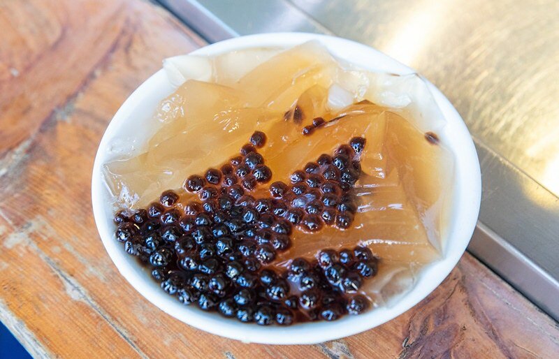 招牌愛玉冰:阿里山的野生愛玉,給的份量還挺多的,除了愛玉還有在低下的杏仁凍和看得很清楚的小粉圓,首先糖水恰到好處的糖,不像我們想像台南都吃很甜,吃到一半可以加料(可樂、雪碧或加啤酒)。