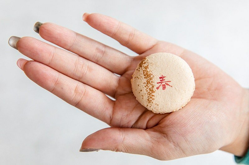 玫瑰口味:淡淡像金色的水波紋外,還有一個討喜的「春」字,湊近聞真有淡淡的玫瑰香氣,入口的甜度適中,帶著我向來偏好的黏化口感,玫瑰的香氣一直很微緩卻一路跟到底,超香的馬卡龍。