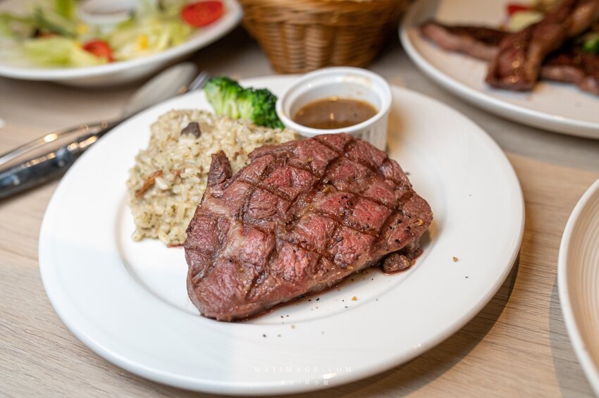 排餐在上桌時使用的是白色瓷盤,可以降低牛排過熟的問題。