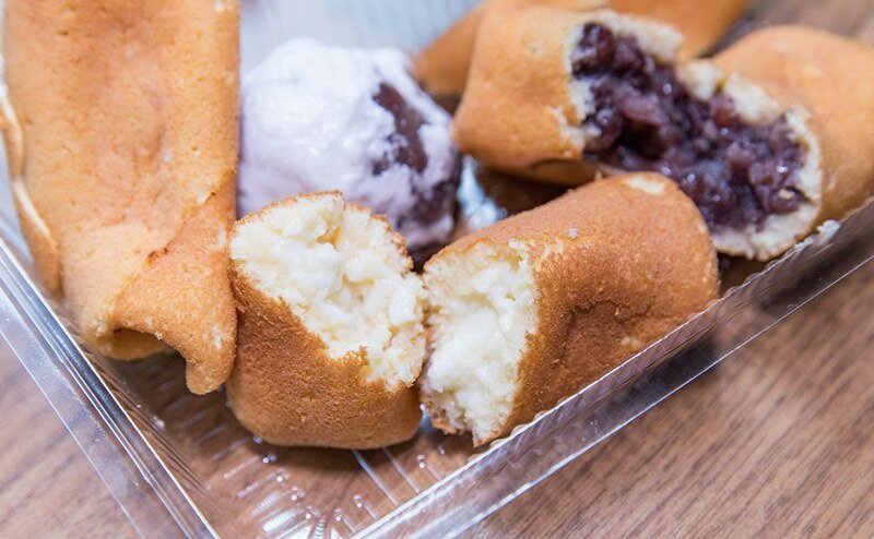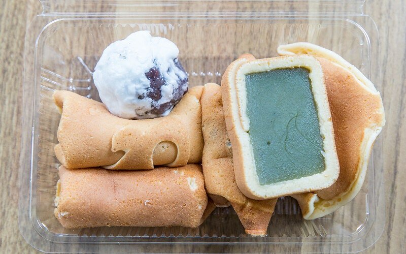 不同口味(紅豆、綠豆、芋頭、 花生、草莓、奶油)的銅鑼燒都是25元,打小我就偏好白頭翁,應該算是我必買的點心,羊羹有紅豆和抹茶兩種口味。