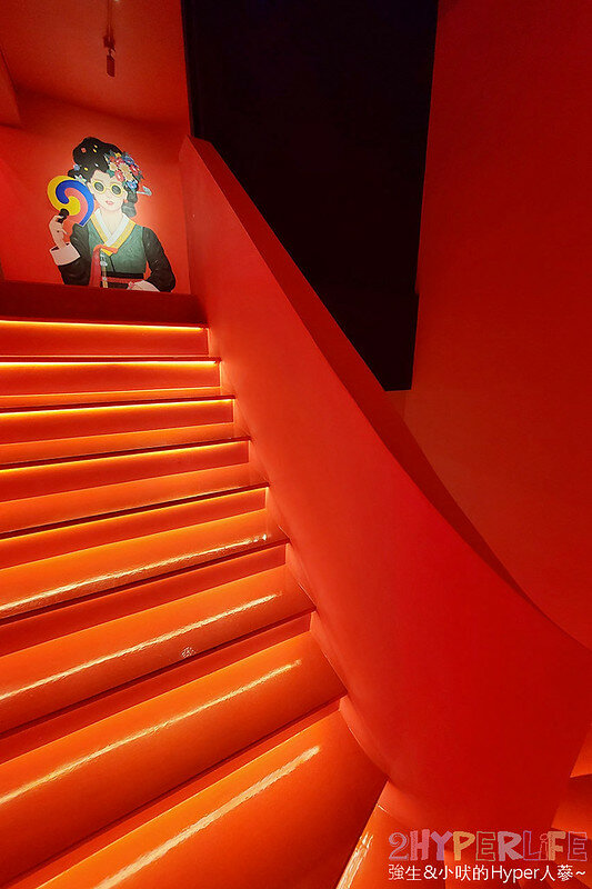 走進去後發現往裡頭看進去是紅色的樓梯搭配裡頭的紅色調,剛看完最新的蝙蝠俠電影一定會有似曾相似的色調感喔