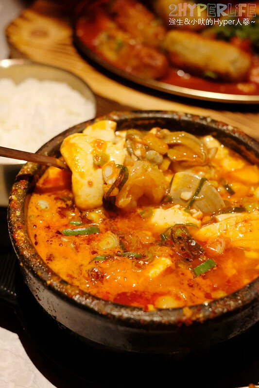 小吠在韓式料理中最愛的就是韓式豆腐鍋,這道好吃有水準!湯頭辣度有是小偏中辣的程度,裡面的料很多,除了豆腐也有蛤蠣、蝦仁、魷魚、蚵仔、節瓜等等。在無法出國回首爾的時刻,能在台中吃到熟悉的道地韓式豆腐鍋辣醬湯,真的覺得超級開心💕,有附白飯還有一顆雞蛋,要趁鍋子還燙的時候,把雞蛋咔下去就對啦