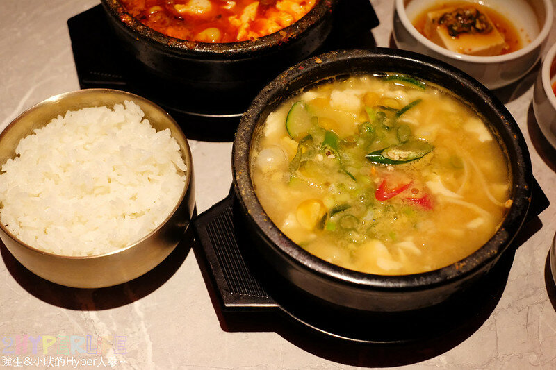 鍋物都有附白飯,而大醬湯就是韓式味噌湯,裡面的料有大顆的蝦仁、豆腐、蛤蠣、金針菇、櫛瓜還有魷魚,喝了很暖胃也很好吃,除了吃到辣椒不然這道其實不太有辣度,很適合初春季節的一道主食