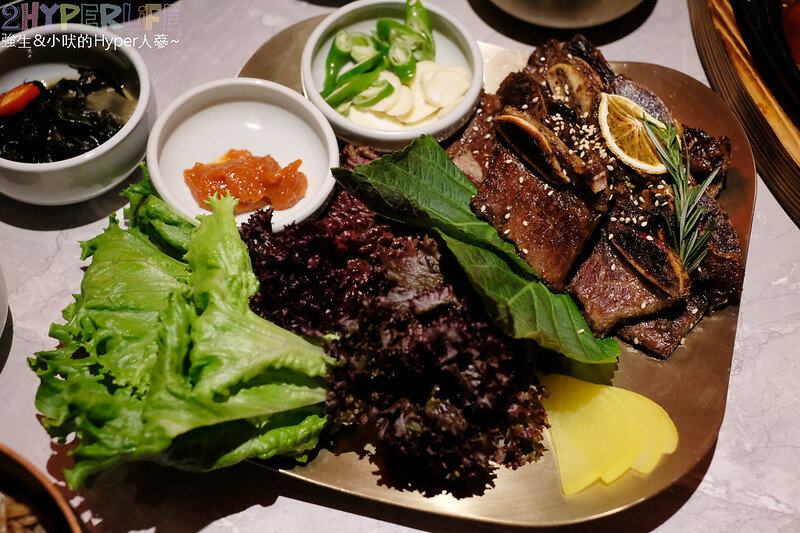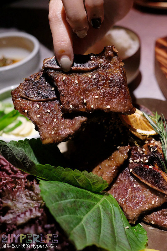 喜歡吃生菜包肉但又不想點肥滋滋的五花肉的話,點這道牛小排準沒錯!牛小排烤得熟度看不到血水,上頭灑上白芝麻增添香氣,有些部分會帶一點點筋,跟生菜還有辣醬和蒜片等配料一起大口塞入嘴巴真的超對味啦