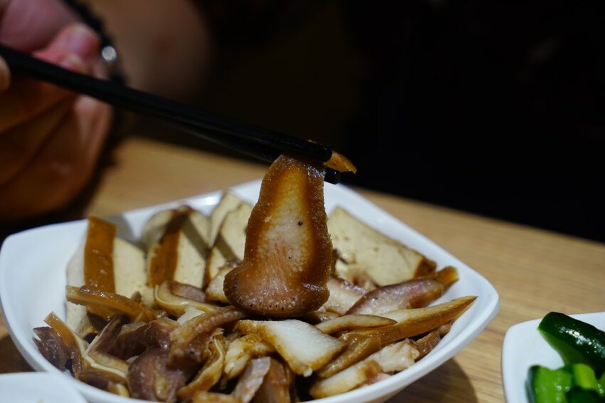 豆乾與豬耳朵很入味,不死鹹,滷汁中香料的香氣滷進食材內,加一點「母老虎辣醬」非常好吃。