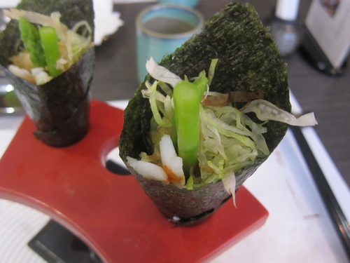 握壽司:裡面有滑嫩嫩的酪梨,海苔仍然是不夠脆。我猜海苔應該沒有事先烤過。
