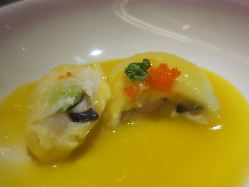 蒸物:上面淋著黃澄澄的南瓜醬汁,上面有漂亮的紅色蝦卵裝飾。
