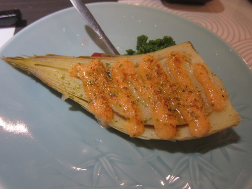 明太子烤竹筍,現在正是竹筍的季節,竹筍十分香甜、非常好吃。