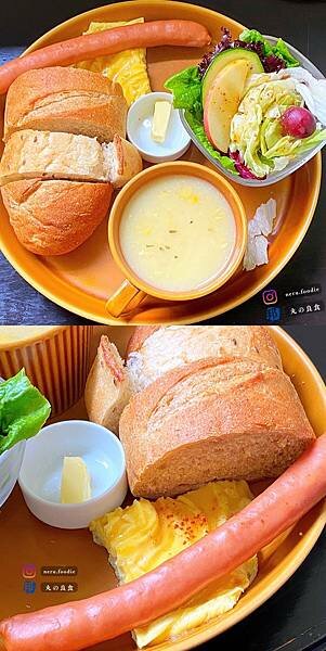 而經典早午餐麵包盤內容物有👉歐式麵包.野菜沙拉.歐姆炒蛋.湯品👈