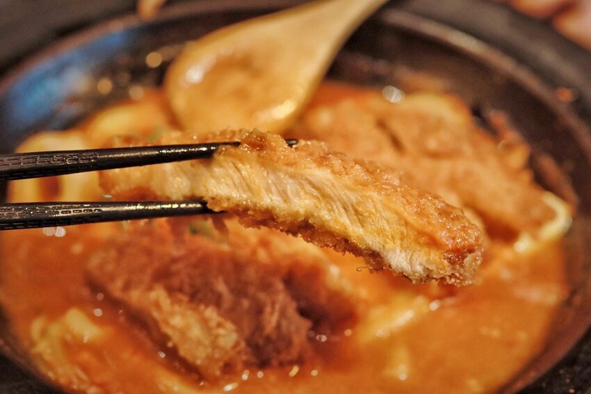 湯底算是韓式辣味噌燉煮烏龍麵,帶點淡淡的甜味,上層再蓋上里肌炸豬排,不需另外加醬就挺不錯;另外他們還附贈了辣油,但必須要說這赤辛鍋對於吃辣的朋友來說是不算辣!