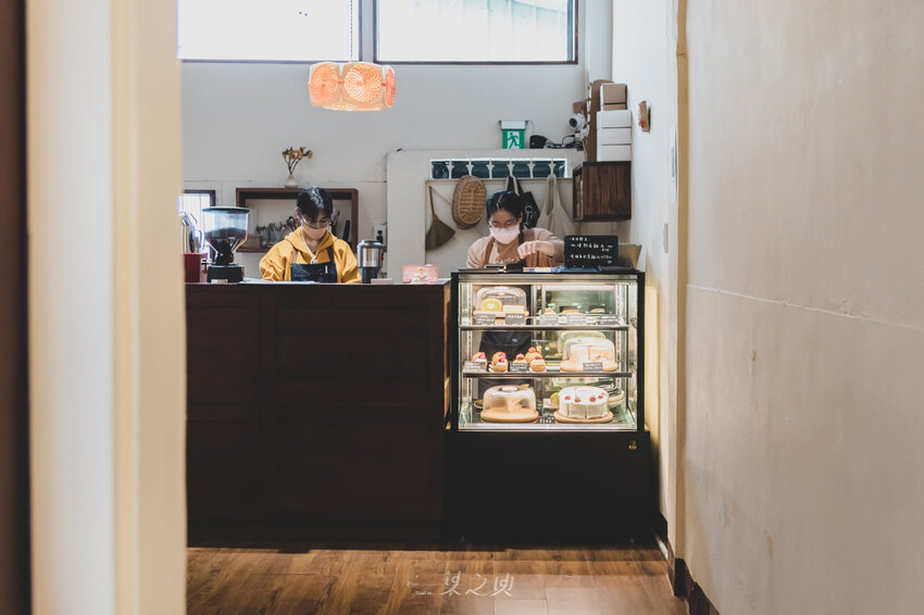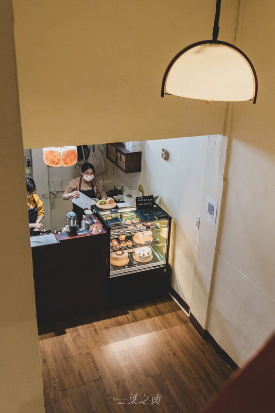 走過長長的廊、經過了廚房的窗,一樓空間的最深處才是櫃台和甜點展示櫃,這樣的空間配置讓我感到有趣,彷彿表示了:在這裡,與其展示出許多美美的甜點,創作出這些甜點的過程才是最值得關注的。