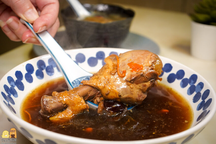 這雞腿肉質久燉不軟爛,看似吸飽溫潤的中藥湯頭