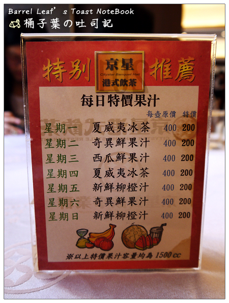 點桌菜的話~再點現榨果汁(奇異果汁/柳橙汁/綜合果汁/西瓜汁)可享半價的優惠。