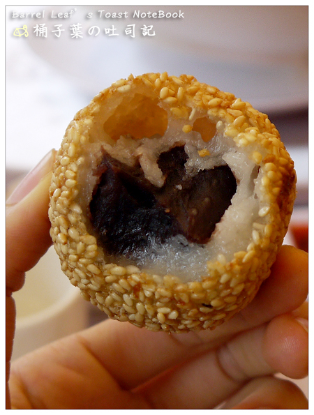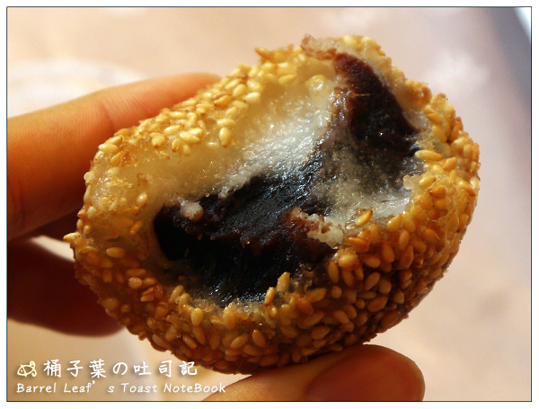 葉子吃的第一顆芝麻球裡頭包的豆沙偏少,不過再吃第二顆就正常了,紅豆沙量足夠~