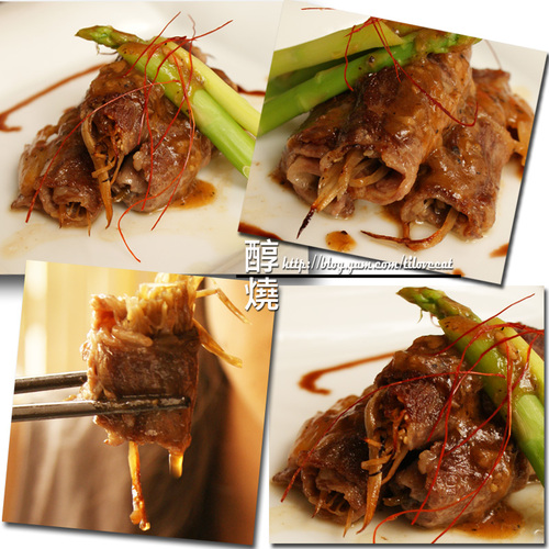 切薄片的牛小排肉捲 搭配翠綠蘆筍