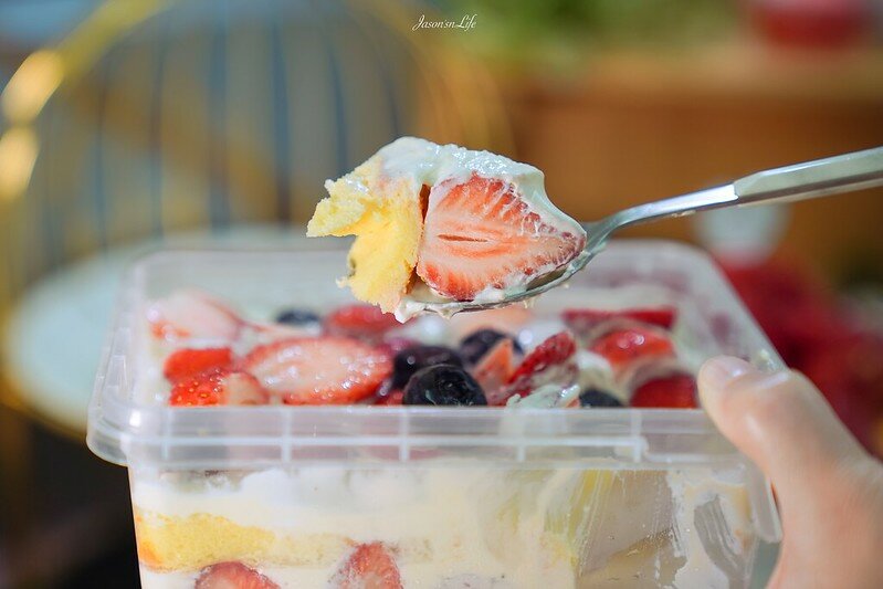 上層鋪著滿滿的頂級鮮奶油,除了草莓以外,還有利用藍莓做顏色的點綴