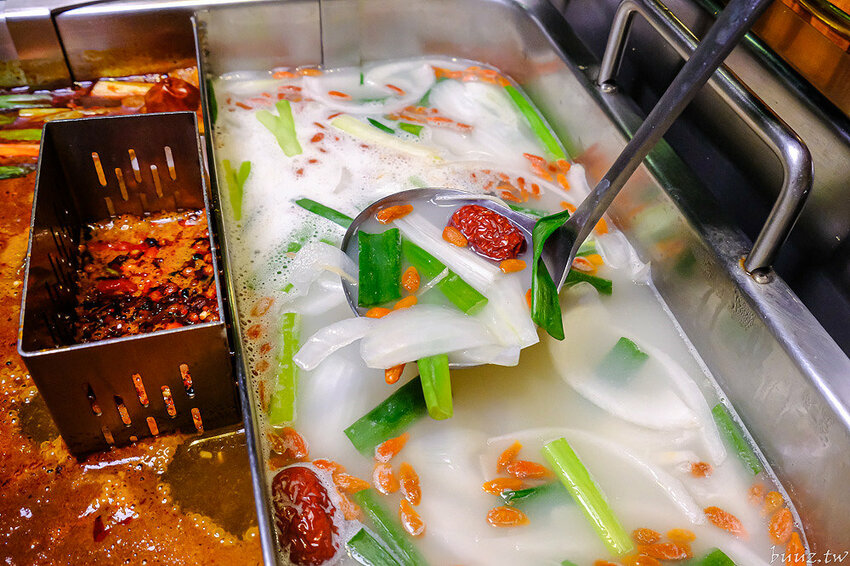 這天點的鍋底分別是招牌龍骨湯及川味麻辣湯,用豬大骨熬煮的龍骨湯,裡面有加入洋蔥、紅棗、枸杞跟蔥段,清甜滋味中帶點胡椒香。