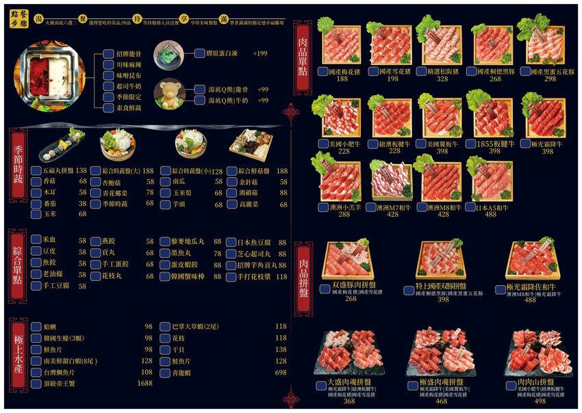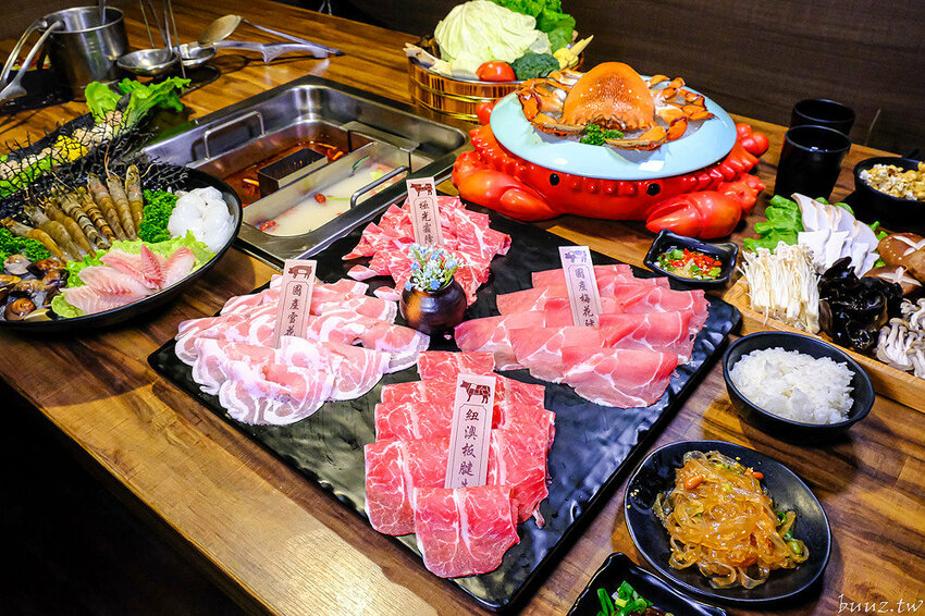 肉品部分有國產豬肉、美國牛肉、澳洲和牛、日本和牛,也可以選擇雙拼或是四拼的肉盤,搭配海鮮、蔬菜、火鍋料以及單點熟食,選擇也相當多元豐富。