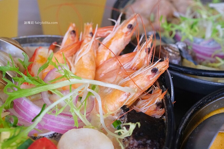我的媽阿!都還沒煮,一鍋鍋食材的堆疊,看起來實在有夠澎派的,有些甚到滿到連鍋子都快放不下,這就是為什麼吃三媽,我還寧願來吃「小二春福氣鍋」,鮮蝦都滿出來了,還有蛤蠣、干貝,一鍋也只要200初,真的好划算。