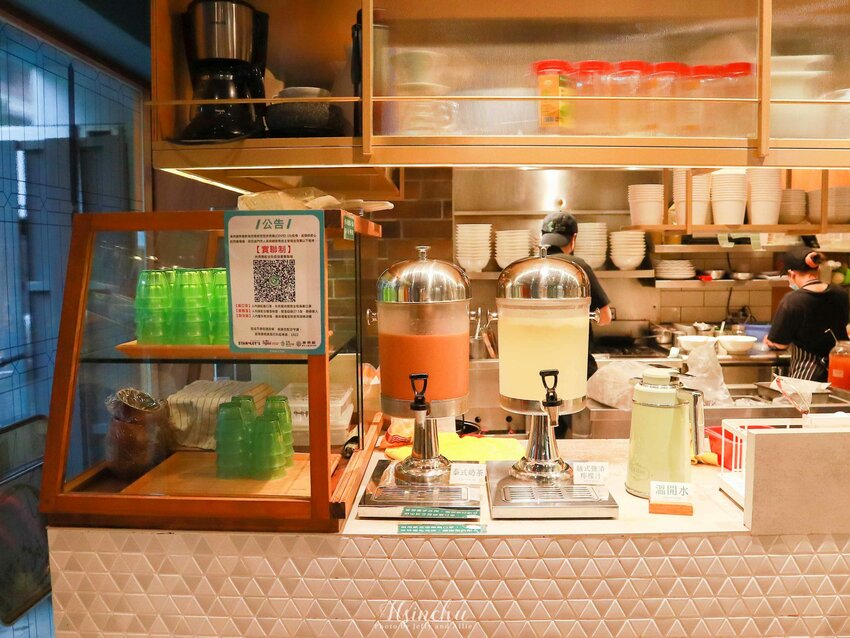 餐廳前方是飲料的自助區,有免費的泰式奶茶、越式鹽漬檸檬汁與溫開水,都可自行取用。中間有加料自助區,提供檸檬塊、豆芽菜以及九層塔,讓客人可以自己調味,客製化自己的湯頭!