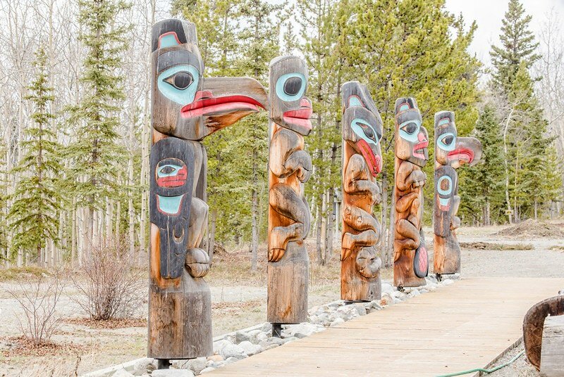 遺產中心的滿門口,可以看到由當地藝術家雕刻的五根傳統氏族柱子。他們代表了 Teslin Tlingit根深蒂固的五個氏族:Kùkhhittàn(烏鴉兒童)、Ishkìtàn(青蛙)、Yanyèdi(狼)、Dèshitàn(海狸)和 Dakhł΄awèdi(鷹),分別像徵著土地、水和空氣的元素。像這個的原住民圖騰在加拿大四處可見,比方說溫哥華史丹利公園布洛克頓角(Brockton Point)的圖騰柱Totem Poles便很具代表性。