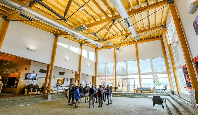 木造混著現代建築的Teslin Tlingit Heritage Centre室內空間,遠比外觀看起來寬敞許多,四邊牆上掛滿以Teslin Tlingit五個氏族的圖騰、畫作及照片。