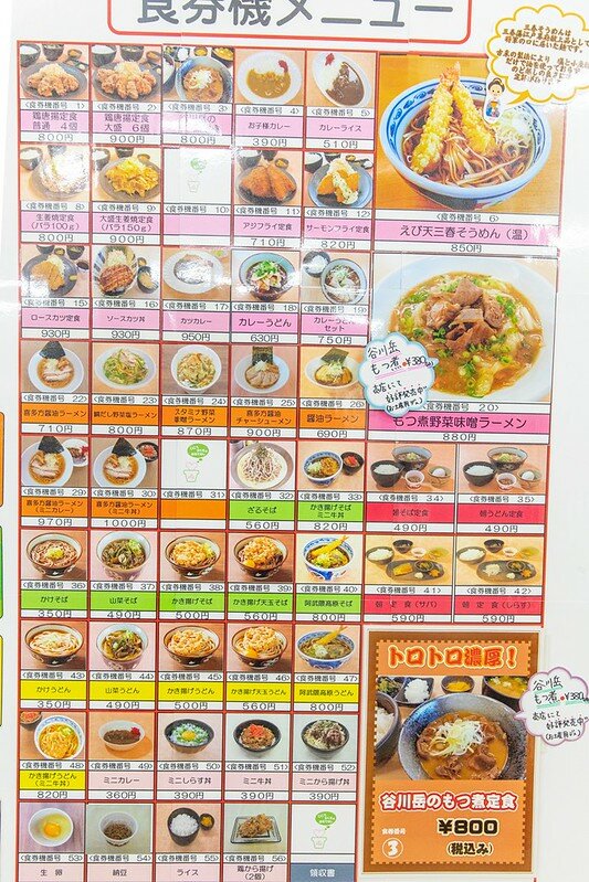 話說看著餐卷機,本來想點的是えび天三春そうめん,對福島瞭若指掌的友人拿了一張DM給我看,那是「阿武隈高原」最受歡迎的餐點前三名DM,上面寫著第1位「鶏唐揚げ定食(大盛)」、第2位「谷川岳のもつ煮定食」、第3位「喜多方醤油ラーメン&ミニカレー」。什麼,居然群馬名物「谷川岳のもつ煮定食」在這比喜多方拉麵還受歡迎...而且純就女性的票選「谷川岳のもつ煮定食」居然還是第一位。