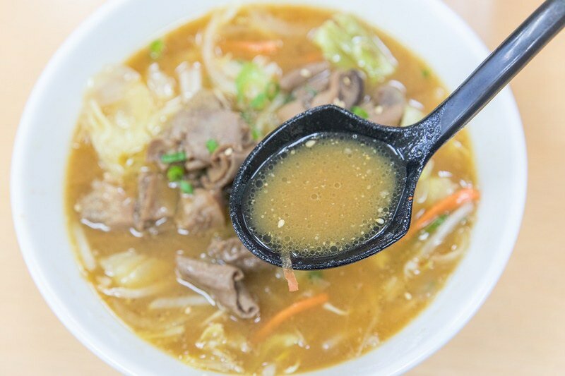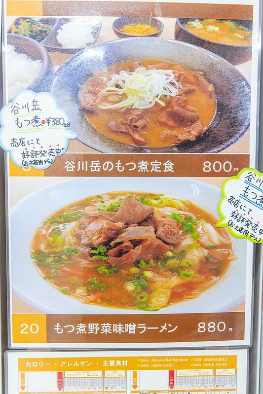 もつ煮野菜味噌ラーメン880日幣,老實說我在日本少說吃過一、兩百碗拉麵,但別說沒吃過,就連見也沒見過這樣的組合,畢竟又是味噌又是もつ煮第一口我已經有很鹹的心理準備,沒想到卻很可以,味噌之餘反而是大量蔬菜的清甜,不過好像沒有群馬盛產的蒟蒻,興許もつ煮是上桌時才淋的,湯中並沒有很重的滋味,反倒是單純的野菜味噌拉麵,這讓我想起石川縣的金澤拉麵。