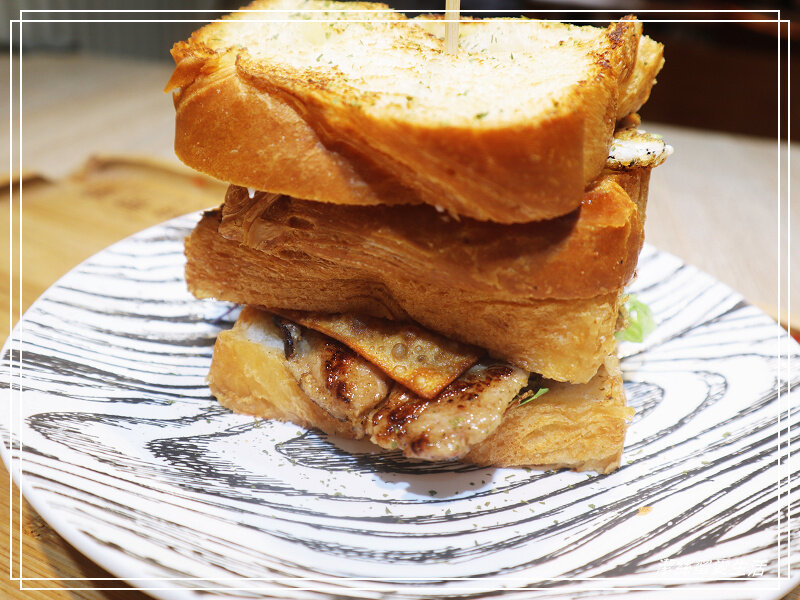 聽說這是店家必點招牌之一,丹麥吐司夾著豬排/煎蛋/生菜/酥脆派皮而成,堆疊高高看起來相當豐盛。
