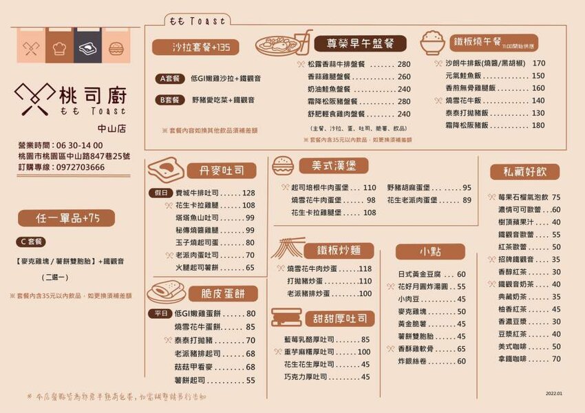 這間早餐店已經放在口袋名單裡一陣子,終於找了個假日出門來朝聖,有好幾家分店的 桃司廚 ,我們這次來的是桃園中山店,準備等等吃完後要過去郭元益糕餅博物館玩耍;以鐵板燒料理結合早午餐的概念覺得蠻特別,是其他一般早午餐比較沒有的特點,趕快來嚐鮮吃吃看囉!
