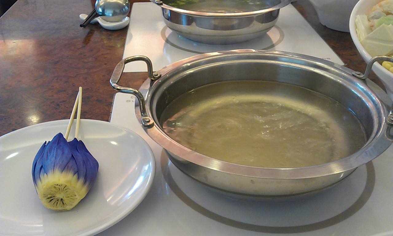 待湯底煮滾後,服務生將蓮花苞輕放入鍋中,