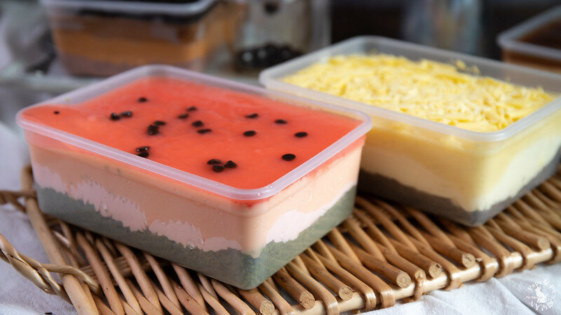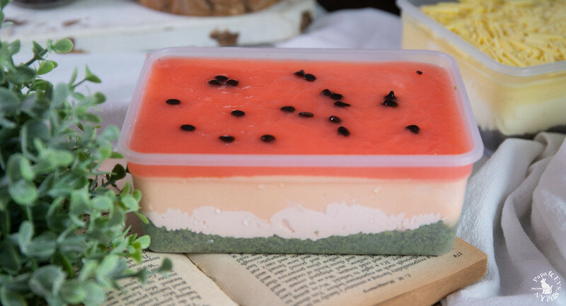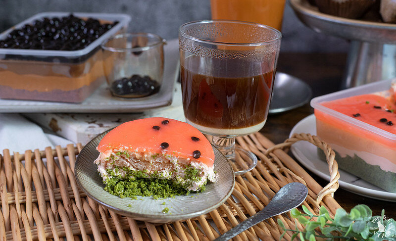 由上到下,西瓜汁寒天凍搭配巧克力豆>西瓜烤布雷>西瓜雪紡蛋糕>西瓜牛奶乳霜>靜岡抹茶餅乾(細碎)