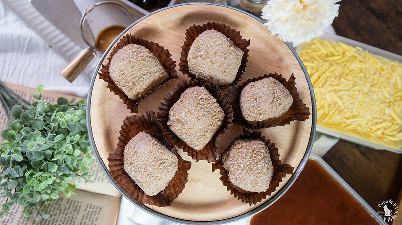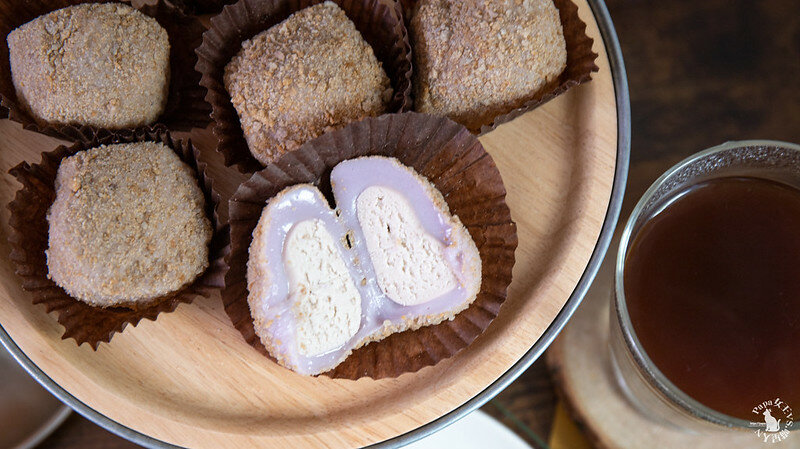 切開後大福(麻糬)呈現夢幻的淡紫色,中間是鮮奶芋頭泥有著淡淡奶香,一口咬下略有一點乳酪鹹香!