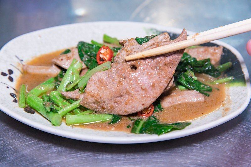 肉燥飯勉強扒了半碗,遠遠就聞到沙茶香,擺盤賣相很粗曠的沙茶豬肝100元,印象中在北部鮮少看到豬肝用沙茶炒,配上是基隆炒牛肉愛用的芥蘭。沙茶香比聞的淡上許多,卻有著濃淡合宜的鹹度,豬肝霸氣非常大塊,卻意外軟嫩到不行,甚至在咀嚼端還能感受到微微的滋潤,炒功硬是了得,加上豬肝的品質好,沙茶的用量恰如其份,好吃的亂八九糟。