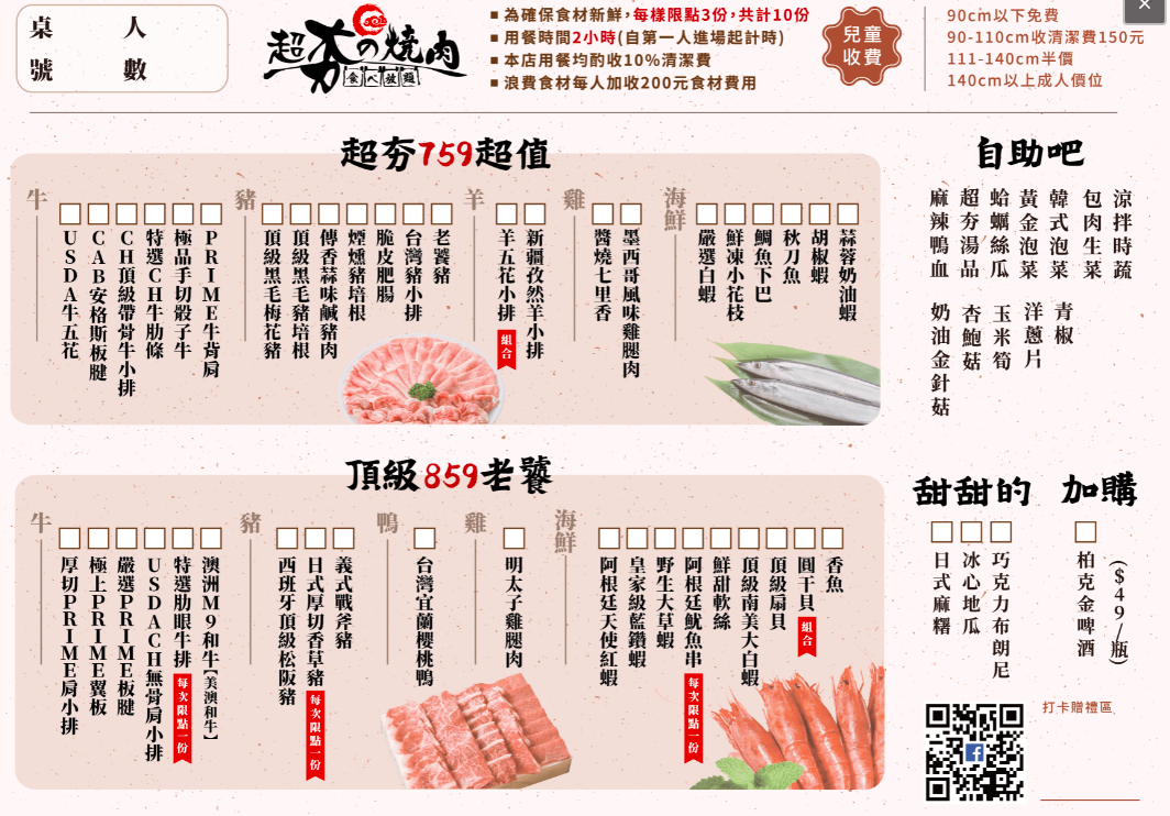 超夯の燒肉吃到飽的價位分成超夯759超值與頂級859老饕兩種,只差一百元,建議大家直接攻頂859元套餐,多了好幾種Prime等級牛肉還有海鮮,餐點選擇更豐富!