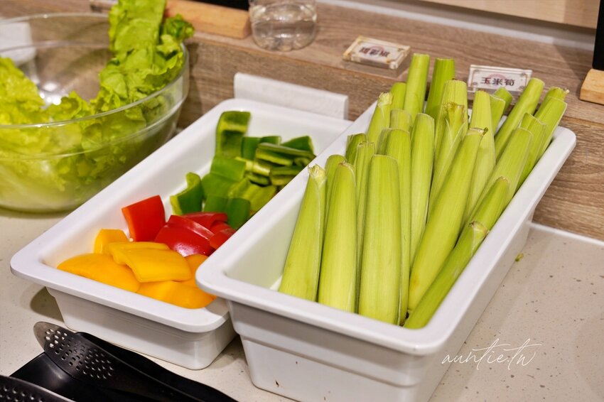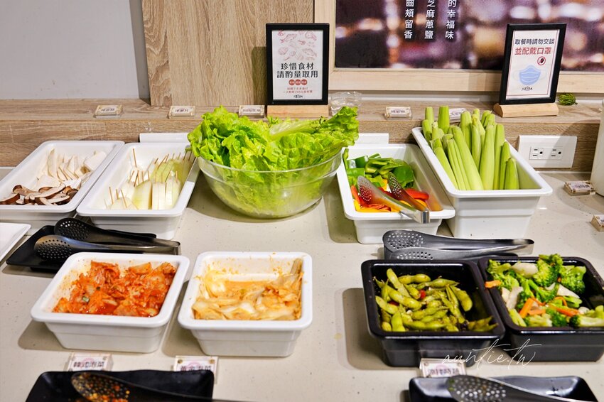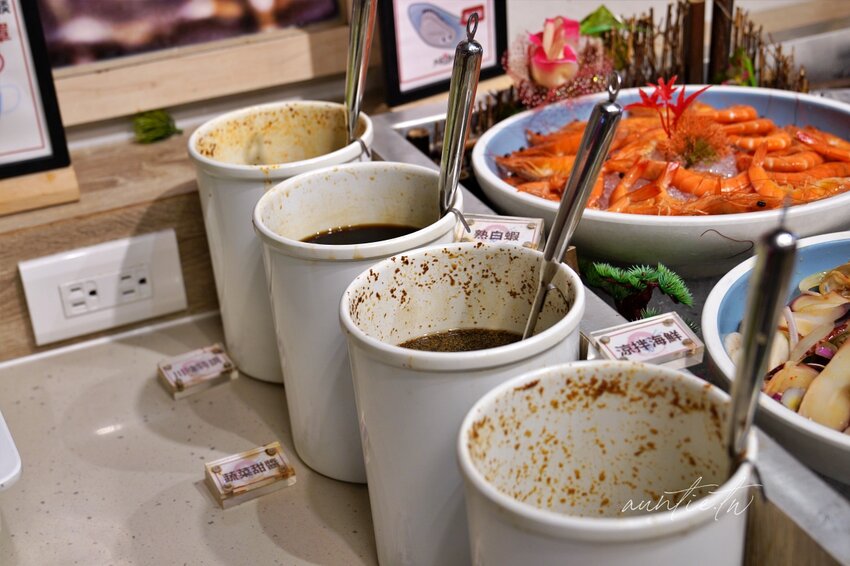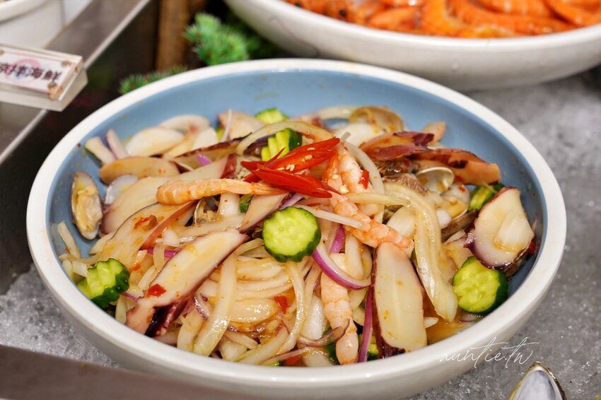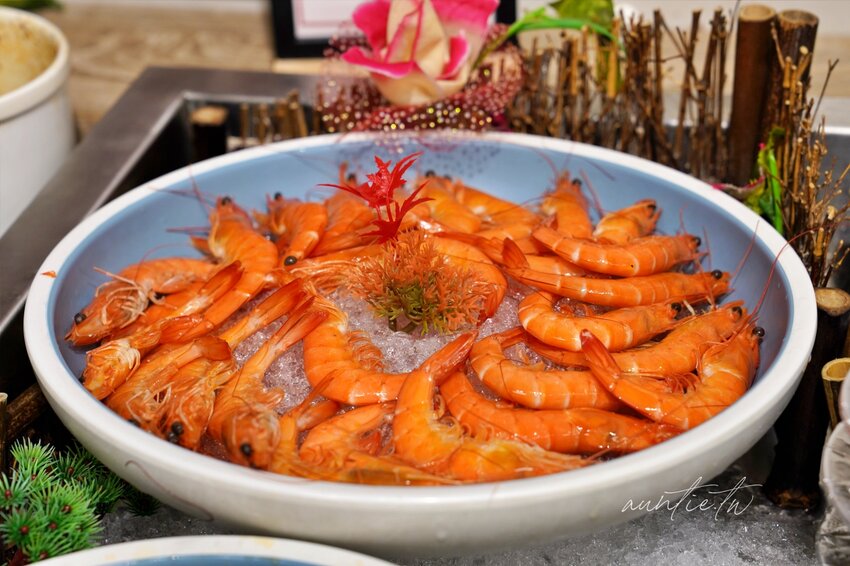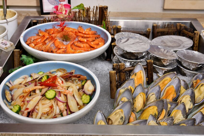 另外一邊則是冷盤自助吧,有白蝦、涼拌海鮮、絲瓜蛤蠣……,還有包肉生菜以及各式小菜、醬料,最特別的是麻辣鴨血、藥燉排骨,還真的是第一次看到。冰淇淋則是選用明治冰淇淋,光是口味就有八種。防疫期間記得取自助吧取餐時要記得戴口罩跟手套唷!