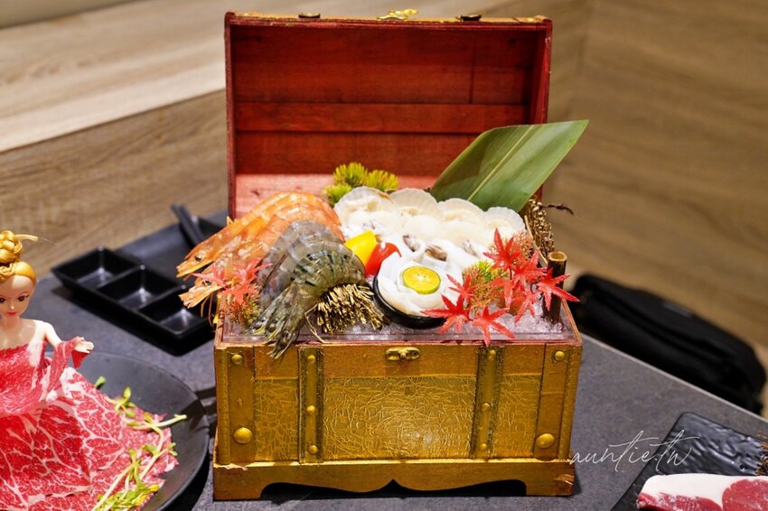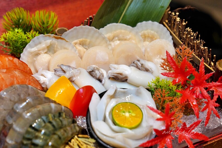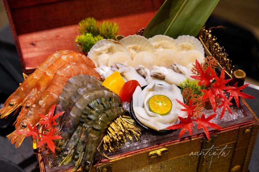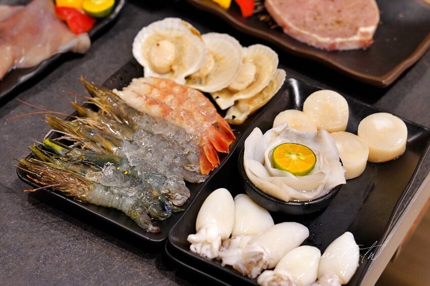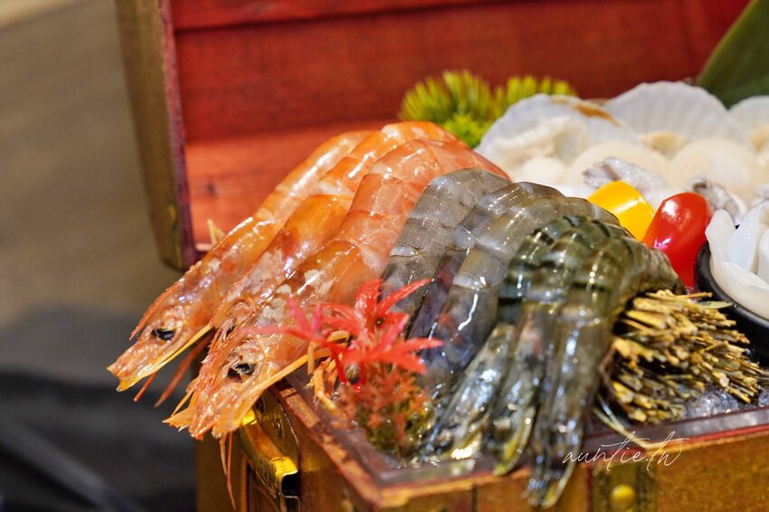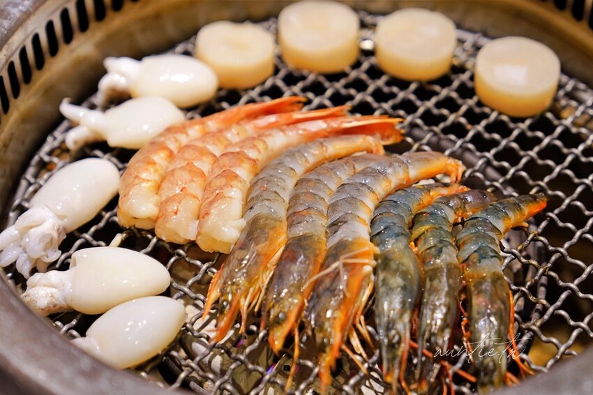 裡面有藍鑽蝦、天使紅蝦、大草蝦、白蝦、圓干貝、扇貝、軟絲、鮮凍小花枝,海味滿滿一整箱,根本就是百寶箱呀!最特別的工作人員還會直接用夾子把蝦殼剝好,這次還順道一起烤好,超推他們的天使紅蝦,口感水嫩肉質鮮甜;圓干貝的口感是彈牙的;烤軟絲與鮮凍小花枝的時候再撒上一些胡椒,口感軟Q,一點點調味就很美味。