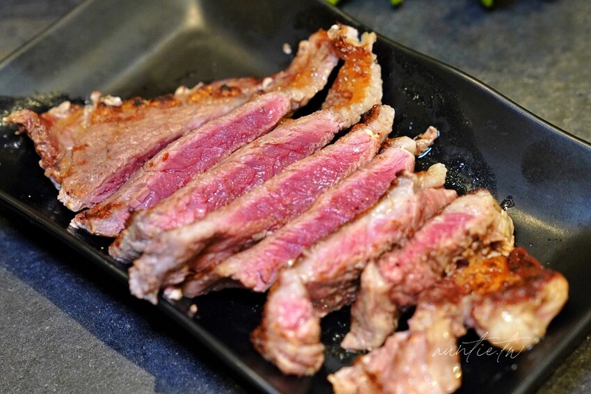 特選肋眼牛排大塊又厚實,建議熟度三~五分,烤到一半還要拿出來靜置熟成冷靜一下,平常吃牛肉就不愛吃太熟,這次烤到三分熟度,口感軟軟嫩嫩,加烤洋蔥一起吃很讚!!