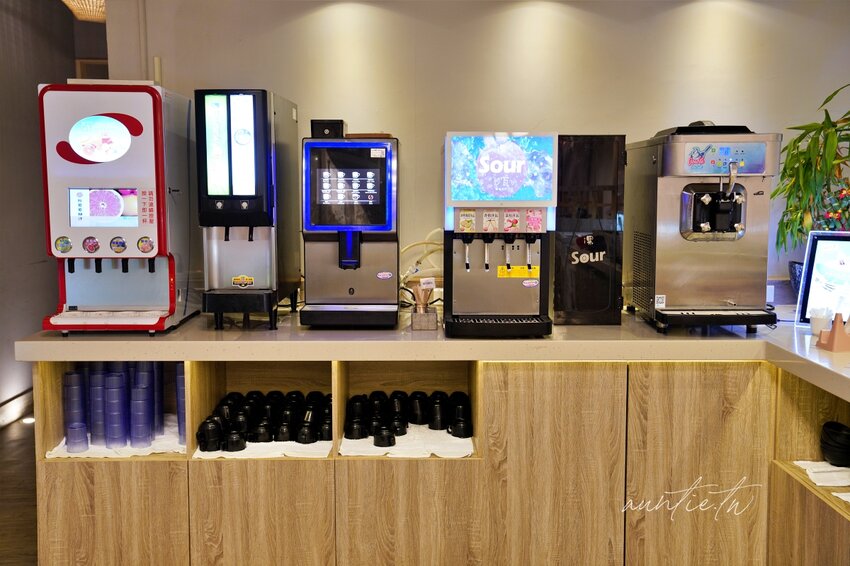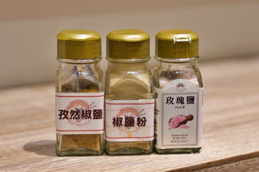 自助吧的飲料品項琳琅滿目,除了一般罐裝碳酸汽水外,還有沙瓦、各類果汁、茶飲、咖啡,光是飲料就是整排滿滿有點難選擇。醬料則有蒜香烤肉醬,和風特調、蔬菜甜醬、川味特調等,桌上還有孜然椒鹽、椒鹽粉、玫瑰鹽,另外還有特製蔥鹽醬,個人最愛這一款,簡直百搭!