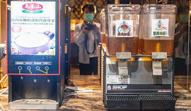 冰箱可以無限自取的飲料、綠茶、紅茶,比較少見的是馬玉山的健康飲。