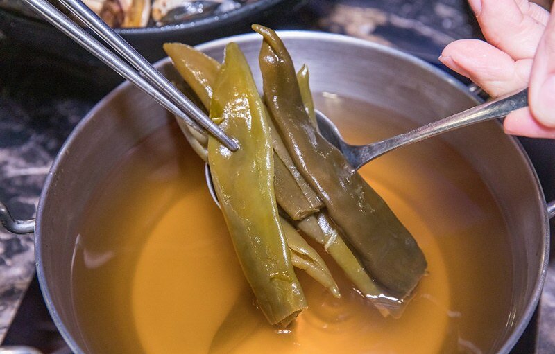 友人推薦的剝皮辣椒湯底,湯裡清楚的看到有七八條剝皮辣椒,問了店員說是花蓮的,試了一下剝皮辣椒的香甜辣真的蠻有滋味的,剝皮辣椒本身不怎辣,反而帶著討喜的甜度。