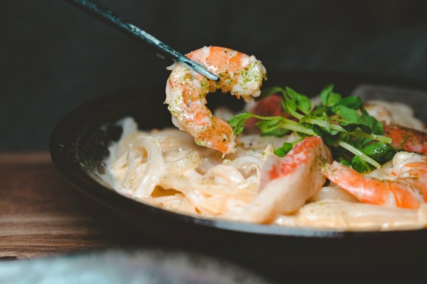 麵條使用烏龍麵吸附了香濃的白醬,非常好咬充滿彈性味道濃郁。