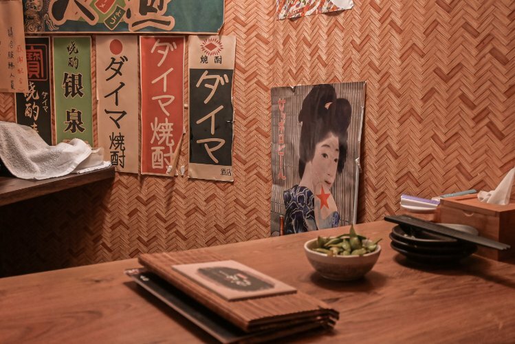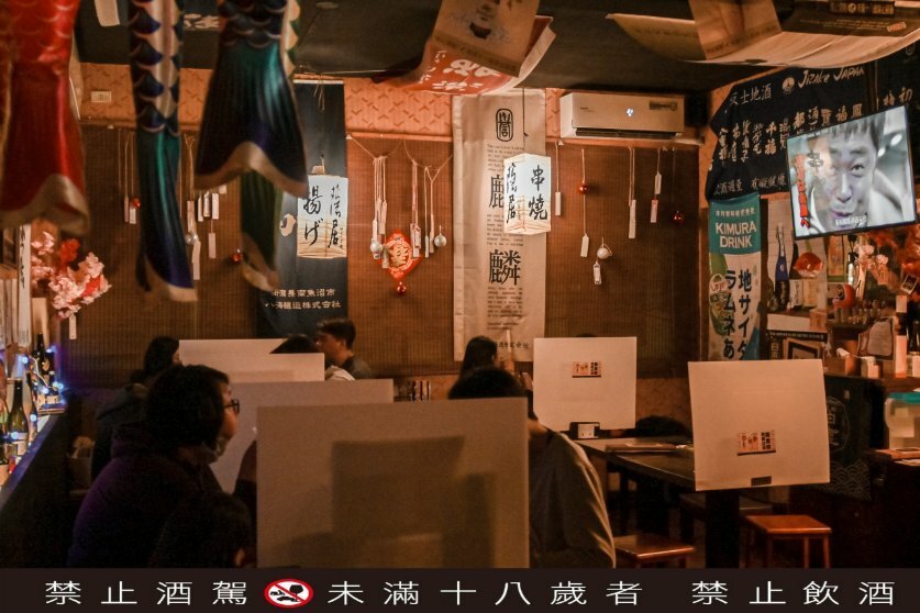 二樓用餐區都有使用隔板隔住,佈置承襲居酒屋一派的作風以酒瓶海報等布置,昏黃的燈光下超有氛圍。