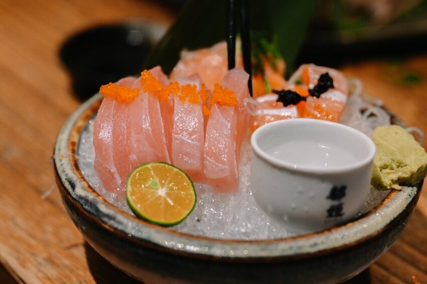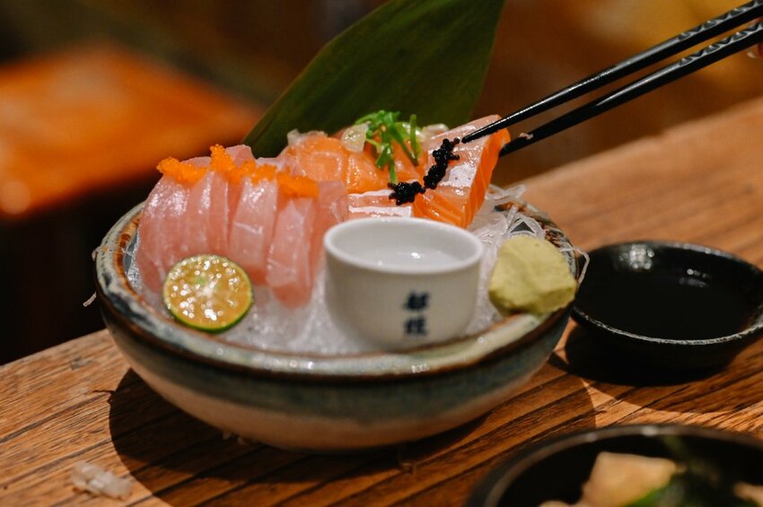 海產都是來自基隆崁仔頂,每日提供的現貨不一定,但保證非常新鮮,生魚片切的很厚實配點哇沙米就超對味。