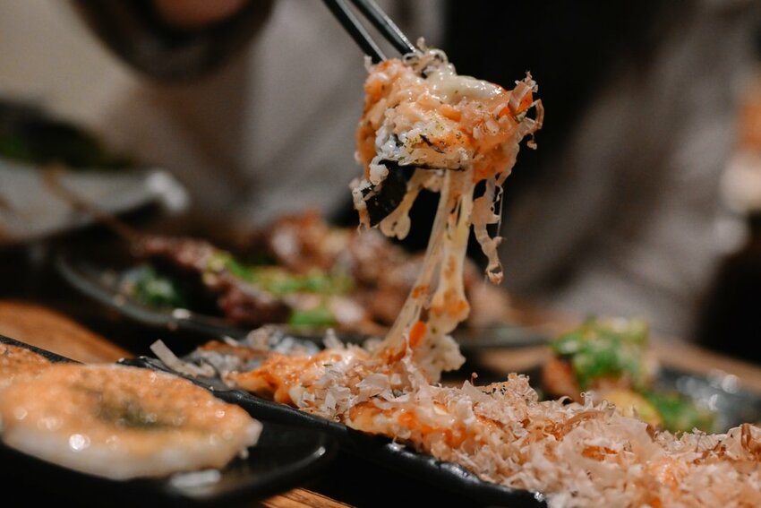 這道很有創意,將海苔加上壽司米鋪上大量起司焗烤,再灑上柴魚片,壽司米吃起來有鍋巴脆脆的口感加上濃郁香濃起司,海鮮料有蝦、花枝等,整體份量十足超有飽足感。
