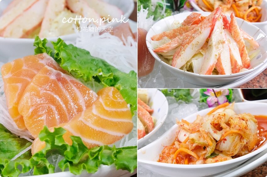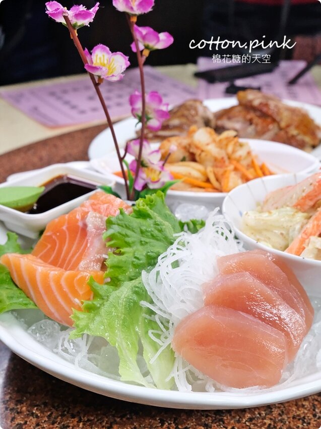 前菜就來一盤澎湃的生魚片拼盤,鮭魚和可和旗魚切得超厚,每一口都是飽滿又鮮甜,另外還搭配蟹肉棒沙拉和韓國泡菜~不管是大朋友還是小朋友的口味都顧到了!