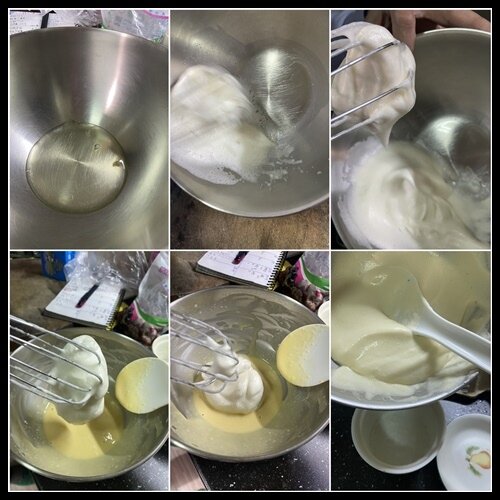4.蛋白霜分2次加入麵糊使用刮刀輕混合