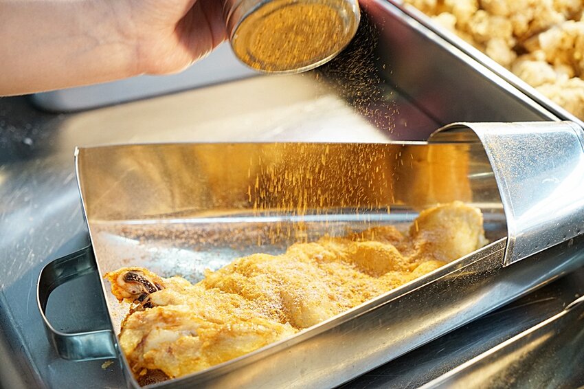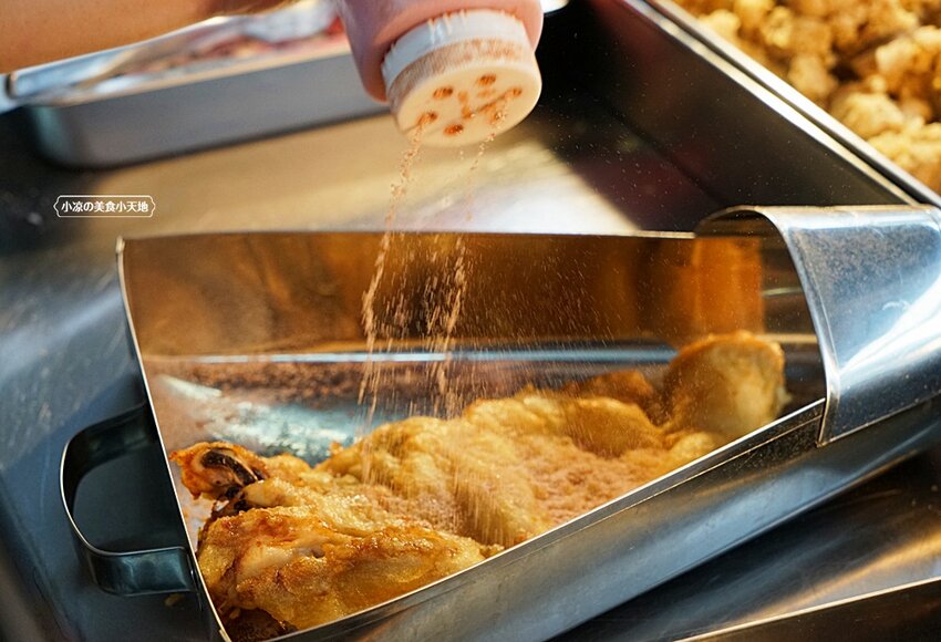 啾ㄠˊ炸雞家的脆皮雞排有四種口味(原味、胡椒、辣味、甘梅),當然還有隱藏版口味(甘梅+辣味),而且小凉發現店家再撒甘梅粉一點都不小氣,直接是瀑布狀的再撒,每一處都均勻地灑上。